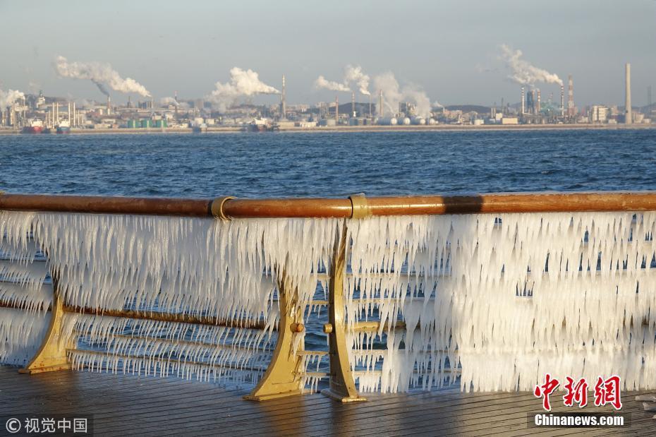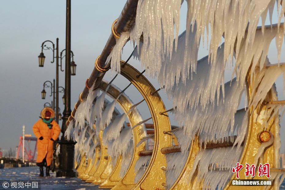 渤海海水在北風(fēng)的作用下涌向岸邊,在大連東港海岸護欄上凝結(jié)成冰凌,形成約有兩公里的冰凌奇觀。圖為大連市東港海岸護欄結(jié)滿晶瑩剔透的冰棱。圖片來源:視覺中國