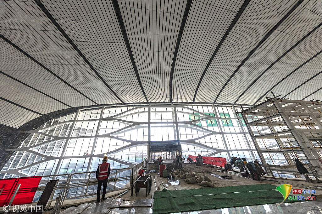 中國青年網(wǎng)北京12月20日電 2018年12月19日,北京大興國際機場航站樓的屋面已基本完工,一只金色“鳳凰”完整地出現(xiàn)在北京城南。航站樓的室內(nèi)裝修在有條不紊的推進中。