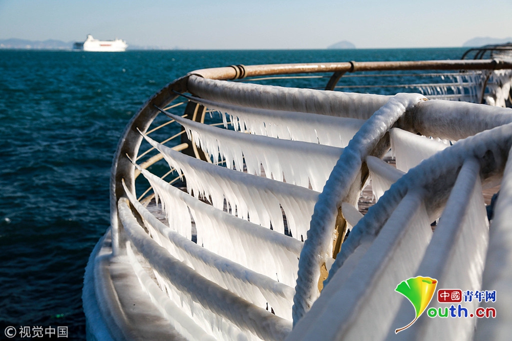 隨著北方持續(xù)低溫,渤海大連海域的海水在潮汐和大風(fēng)的作用下涌上岸邊,在護欄上凝結(jié)成大面積的冰凌景觀。