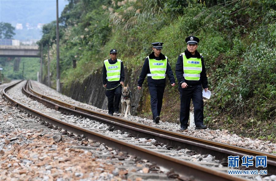 陸日峰(前)和同事在中越邊境巡線(2018年12月31日攝)。陸日峰是南寧鐵路公安處憑祥站派出所民警,中越國際客運列車開行10年,他就守護了10年。十年來,他平均每3天要到中越鐵路交界點的湘桂線鐵路終點巡線。