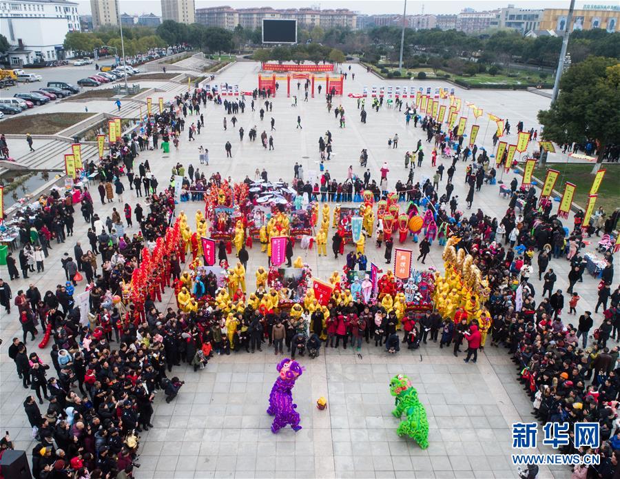 1月1日,演員在展演活動上進行舞龍舞獅等非遺傳統(tǒng)文化表演(無人機拍攝)。2019年元旦,浙江省桐鄉(xiāng)市濮院鎮(zhèn)舉辦新年“非遺文化藝術節(jié)”活動,濮院鎮(zhèn)下屬多個鄉(xiāng)村的傳統(tǒng)美食制作、手工藝品、非遺文化表演等鄉(xiāng)村特色非遺項目在濮院鎮(zhèn)中心廣場進行集中展示展演。新華社記者 徐昱 攝