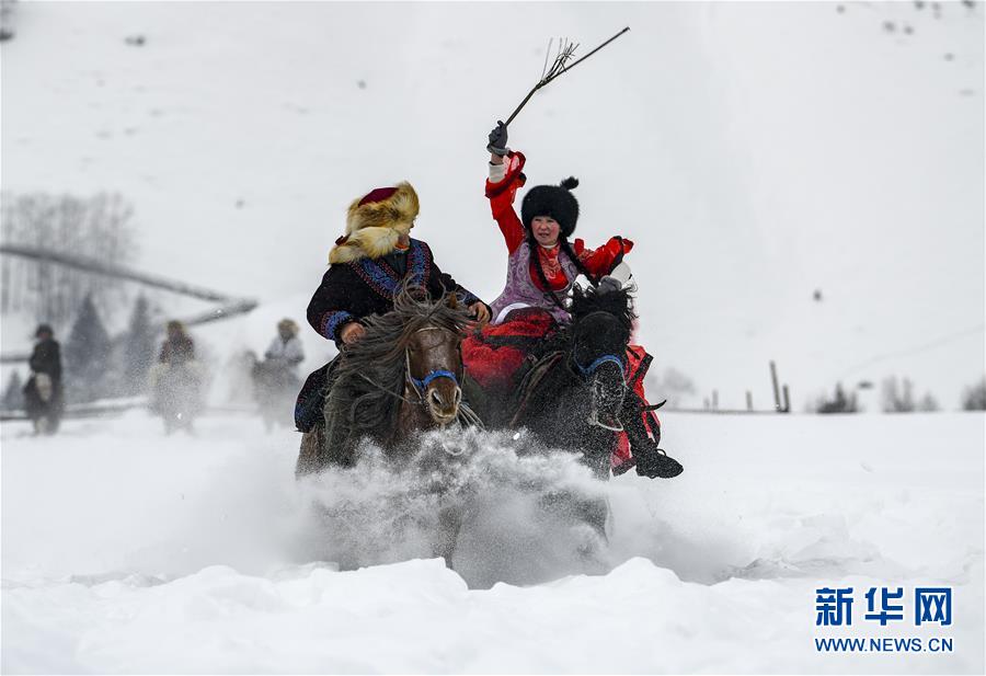 1月1日,在新疆禾木雪鄉(xiāng),當地居民表演“雪地姑娘追”。