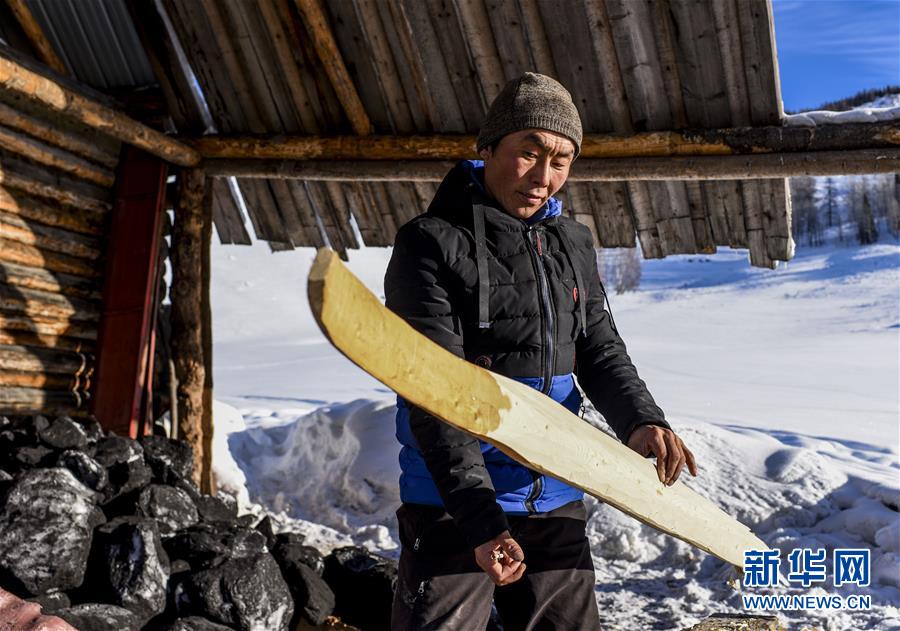 在新疆布爾津縣禾木村的一處冬季牧場(chǎng),森格爾在制作毛皮滑雪板時(shí)檢查滑雪板的平面(1月3日攝)。新華社記者 胡虎虎 攝