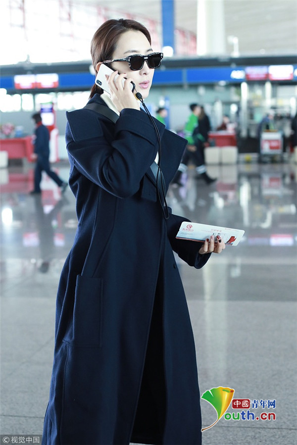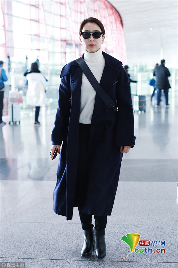 2019年1月7日,北京,馬蘇現身機場。她身穿黑色到腳大衣霸氣外露,架黑超涂紅唇似帥氣“女特工”。