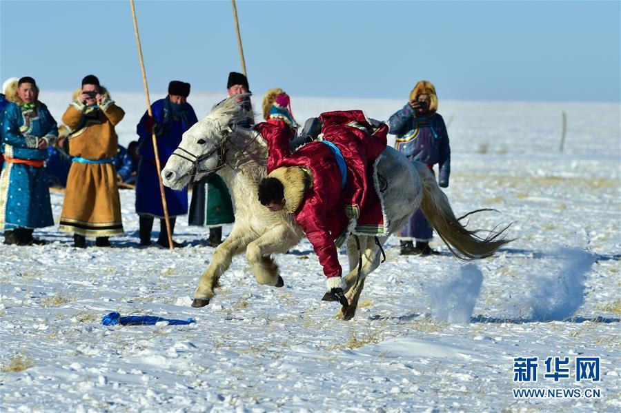 1月8日,牧民表演馬背拾哈達。 時下正值草原冬季旅游旺季,內(nèi)蒙古自治區(qū)西烏珠穆沁旗的牧民們在雪原上一展身手,為游客展現(xiàn)獨特的民族風(fēng)情。 新華社記者 鄒予 攝