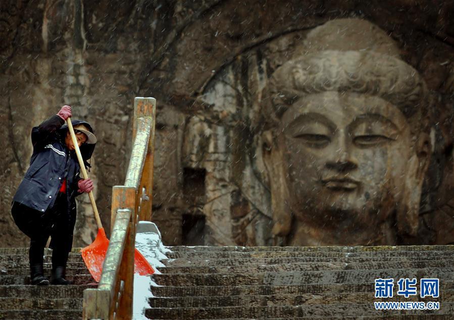 1月9日,清潔工在洛陽龍門石窟景區(qū)內(nèi)的盧舍那大佛前清掃積雪。 新華社記者李安攝