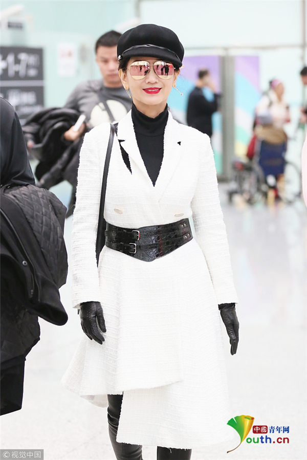 1月10日,廣東省深圳市,趙雅芝夫婦現(xiàn)身深圳寶安機(jī)場,頭戴貝雷帽的她架著反光墨鏡,一襲白色不規(guī)則連衣裙配上黑色腰封及皮靴,酷似甜美女教官!