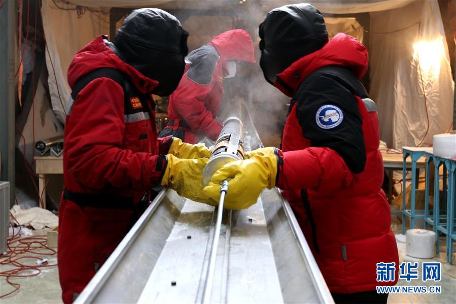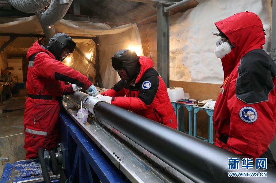 科考隊(duì)員處理鉆取的2.8米長(zhǎng)冰芯(1月12日攝)。 新華社記者 劉詩(shī)平 攝