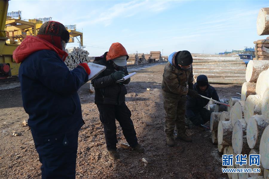 1月12日,在滿洲里鐵路口岸站裝卸二車間原木換裝場區(qū),工作人員對進口落地原木進行檢尺核對工作。