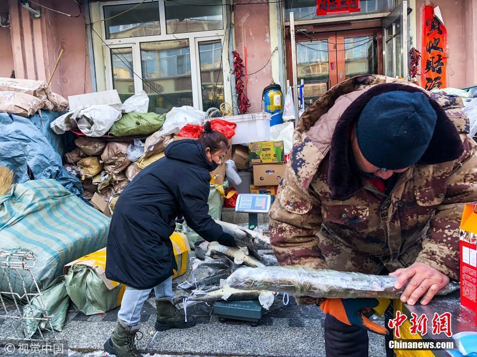 1月12日,黑龍江省佳木斯市撫遠東極魚市,商戶在整理凍魚。棋簿紫 攝 圖片來源:視覺中國