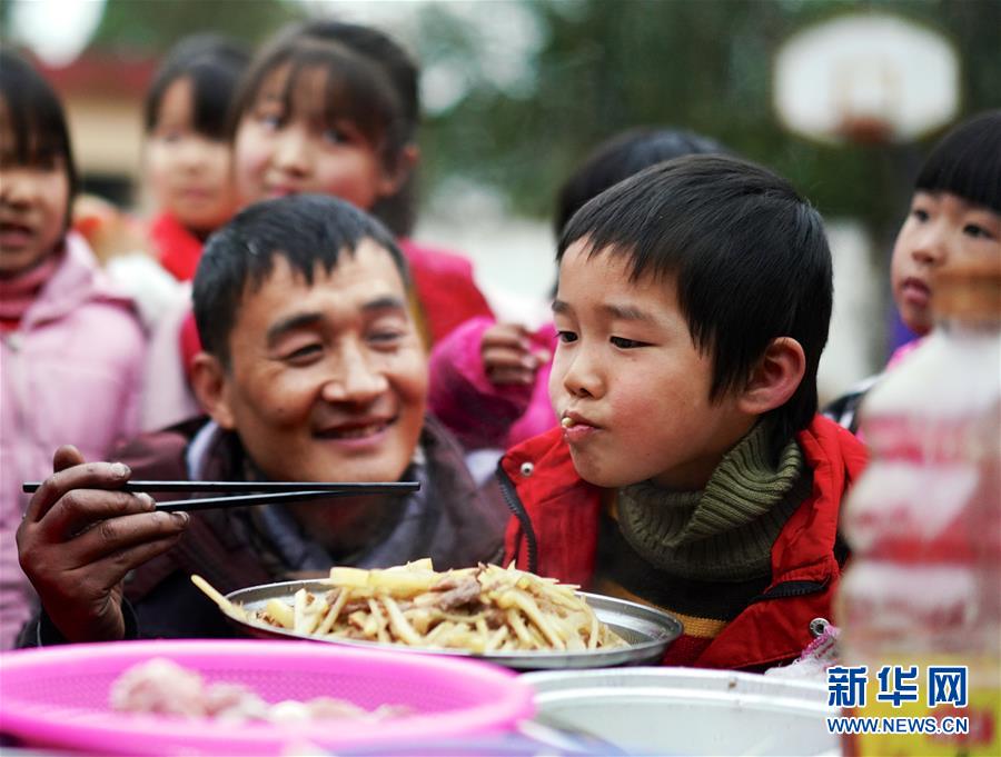 1月3日,章站亮(前左)給一位學生品嘗剛出鍋的土豆燒肉。 新華社記者 胡晨歡 攝