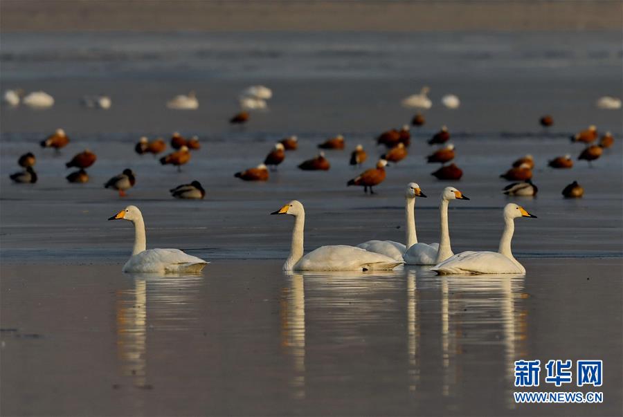 1月13日,天鵝等水鳥在張家口市宣化區(qū)洋河水庫休憩。 近年來,河北省張家口市宣化區(qū)立足京津冀生態(tài)涵養(yǎng)區(qū)的功能定位,不斷加大環(huán)境治理和生態(tài)功能修復(fù)力度,使洋河水庫及周邊濕地成為天鵝、大雁、野鴨、灰鶴等多種鳥類南北遷徙中的棲息地。 新華社記者楊世堯攝