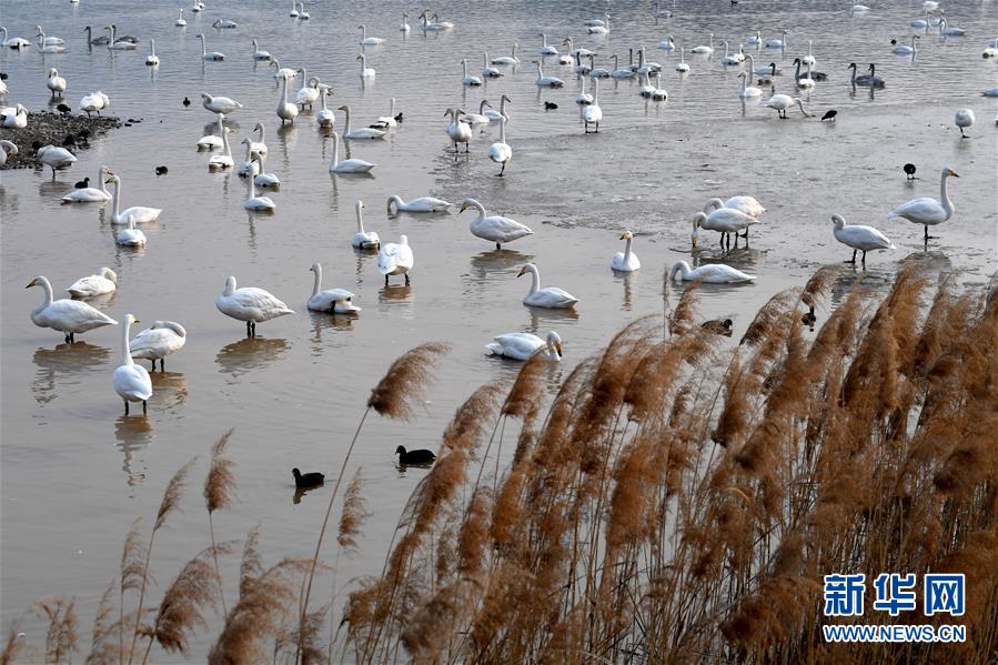 1月3日,白天鵝在三門峽黃河濕地棲息。 新華社記者王丁攝