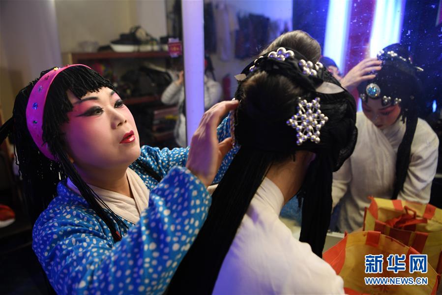 1月14日,在頤融堂戲曲體驗館里,演員在登臺前整理發(fā)飾。新華社記者 范培珅 攝