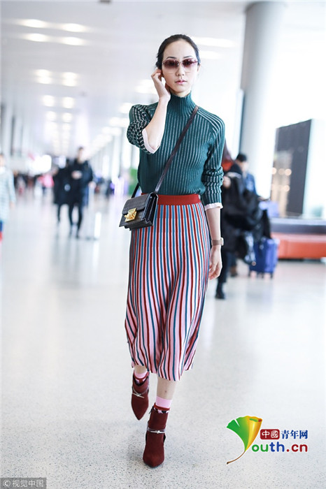 2019年1月17日,上海,韓雪現(xiàn)身機(jī)場,穿著條紋紗裙露出小腿,十分抗凍,她搭配經(jīng)典的駝色大衣,氣質(zhì)出眾在機(jī)場人群中相當(dāng)搶鏡。