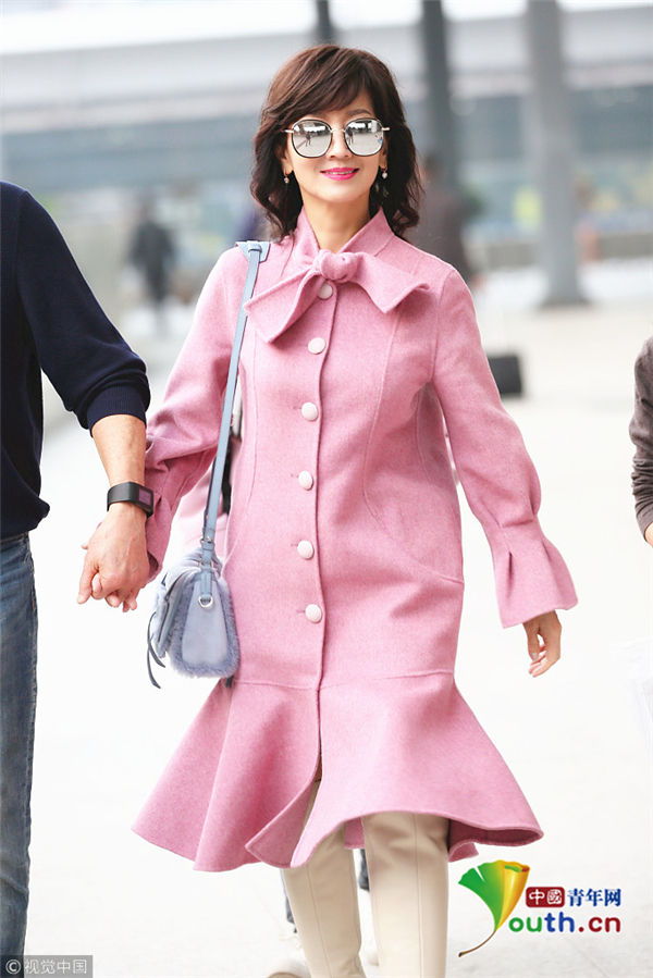 趙雅芝著粉嫩魚尾大衣優(yōu)雅甜美 獲老公一路牽手