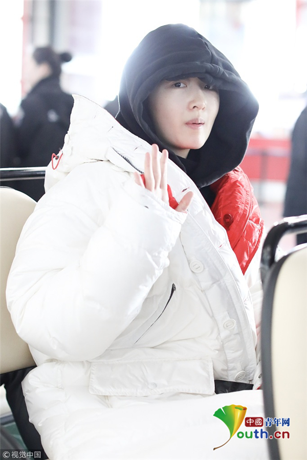 1月23日,北京,周冬雨現(xiàn)身機(jī)場(chǎng)。她用黑色連衣帽罩頭襯托巴掌臉,把下巴擱在行李車推桿上的雙手上呆萌可愛(ài) 。