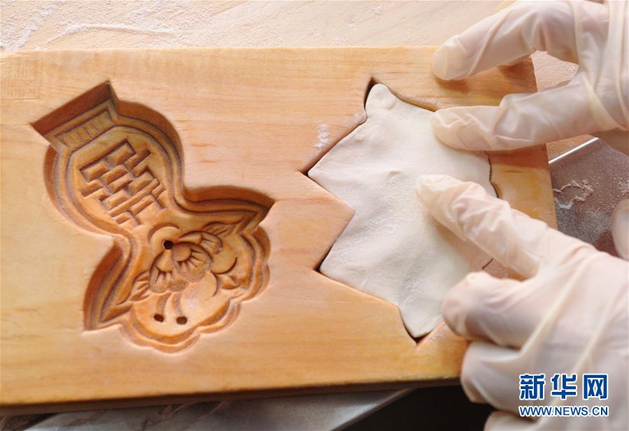 1月31日,河北黃驊市一家面花作坊的工人用面花模子制作面花。 河北黃驊市有著過年蒸面花的習俗。春節(jié)前夕,當?shù)孛婊ㄖ谱鞴S加班加點制作面花,供應春節(jié)市場。 新華社記者牟宇攝