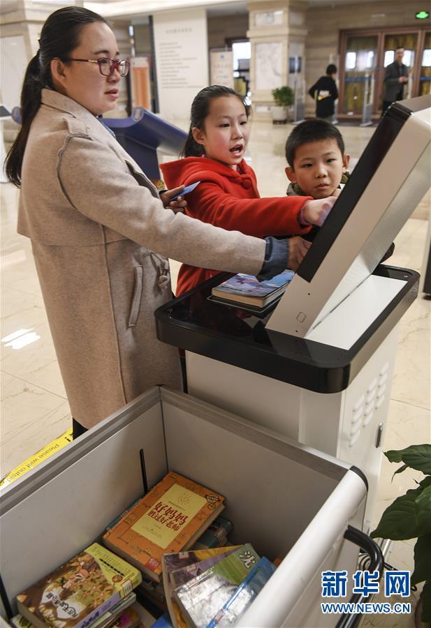 2月24日,一名家長(zhǎng)帶孩子在府谷縣圖書(shū)館自助借還機(jī)上借閱圖書(shū)。 新華社記者 陶明 攝