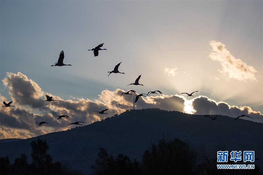 3月7日,在以色列阿格蒙胡拉鳥(niǎo)類(lèi)和自然公園,一群灰鶴在天空中飛翔。新華社記者郭昱攝