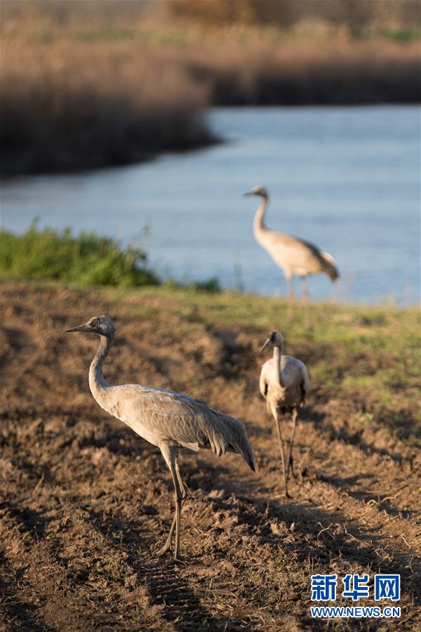 3月7日,在以色列阿格蒙胡拉鳥(niǎo)類(lèi)和自然公園,幾只灰鶴在水邊休息。新華社記者郭昱攝