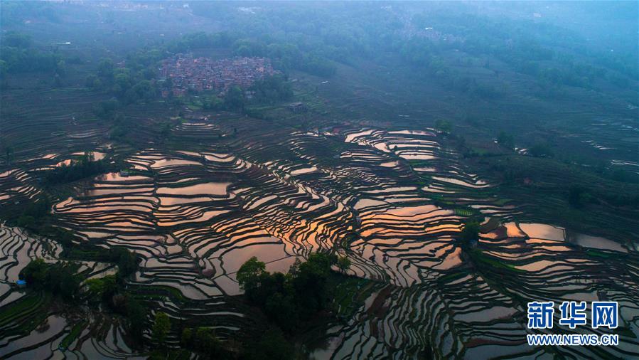 這是在云南省元陽(yáng)縣拍攝的傍晚時(shí)分的哈尼梯田美景(4月3日無(wú)人機(jī)拍攝)。哈尼梯田位于云南省哀牢山南部,以哈尼族為主的當(dāng)?shù)厝罕娗О倌陙?lái)生生不息在大地上“雕刻”出這一農(nóng)耕文明奇觀。春日里,漫山的水稻梯田與云海、森林、村莊形成一幅美麗的畫(huà)卷,吸引眾多海內(nèi)外游客前來(lái)觀賞。新華社記者 胡超 攝