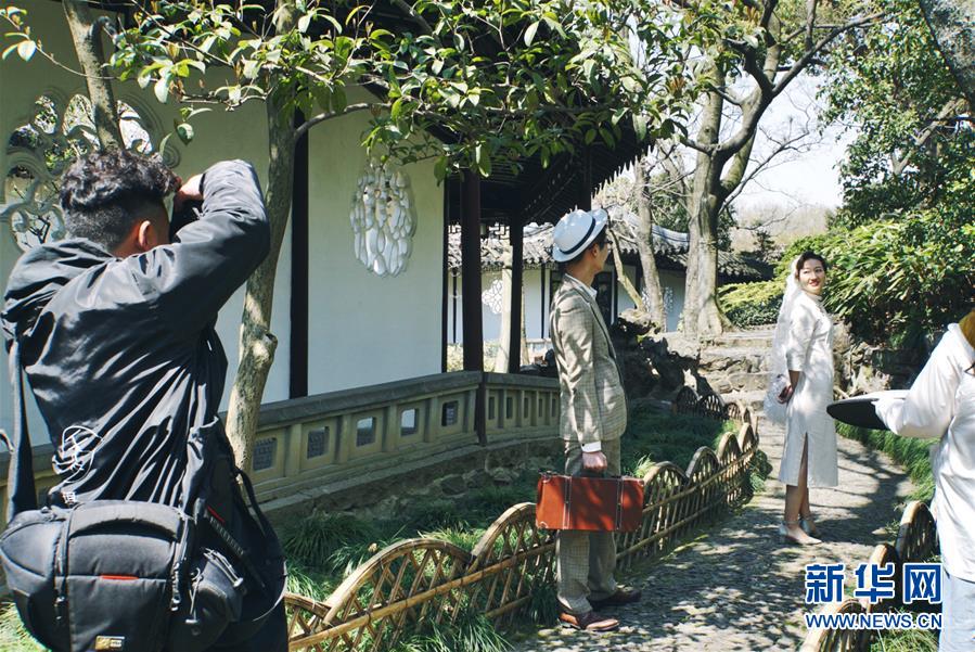 2019年4月1日,一對夫妻在中國蘇州滄浪亭內(nèi)拍婚紗照。2000年,滄浪亭和藝圃、耦園、獅子林、退思園作為蘇州古典園林的擴展項目被列入聯(lián)合國教科文組織世界文化遺產(chǎn)名單。 新華社記者杜涓涓攝