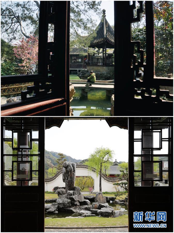 這張拼版照片展示的是:上圖,2019年4月2日拍攝的中國蘇州留園一景(新華社記者杜涓涓攝);下圖,2017年4月28日拍攝的美國紐約寄興園一景(新華社記者王迎攝)。