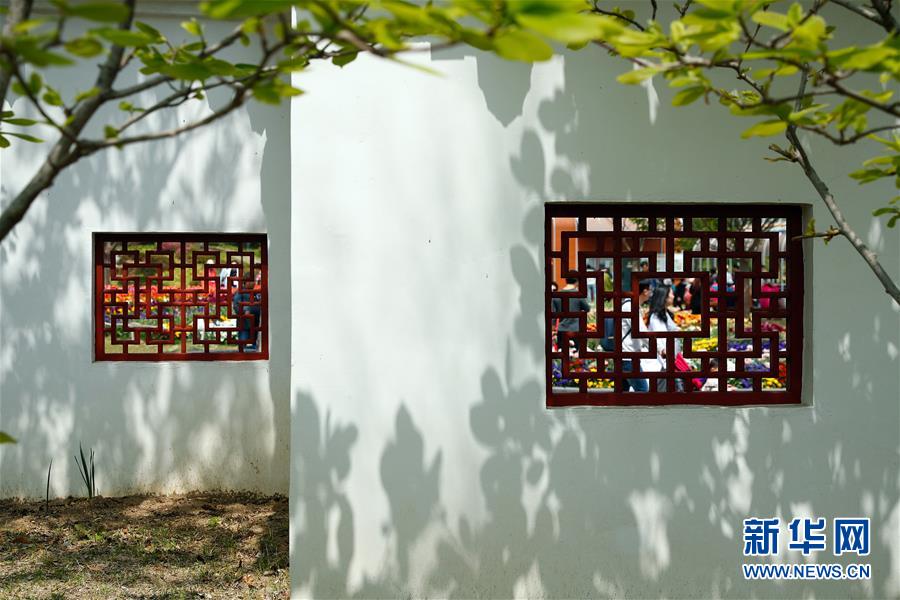 2017年4月28日,游客在美國紐約寄興園內(nèi)游覽。仿照中國蘇州園林設計建造的寄興園位于紐約斯塔滕島,占地面積約4000平方米,其所用的建筑材料大都在蘇州加工制造,并由40名來自蘇州的藝術家和工匠歷時6個月在紐約修建而成。 新華社記者王迎攝