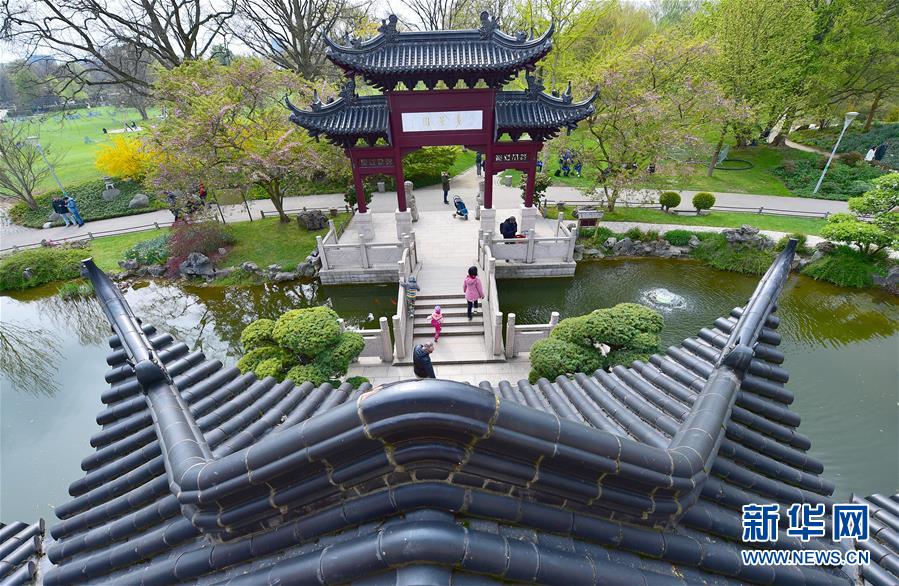 2019年4月13日,在德國(guó)曼海姆,游客在中式園林“多景園”內(nèi)游玩?!岸嗑皥@”位于曼海姆市路易森公園內(nèi),占地約6000平方米,建筑面積約1500平方米,是目前歐洲最為完整的中國(guó)古典園林建筑群落之一。 新華社記者逯陽(yáng)攝