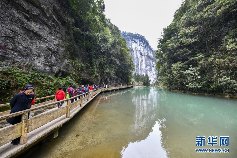 游客在天生三橋景區(qū)游覽(3月27日攝)。 隨著天氣轉(zhuǎn)暖,重慶武隆天生三橋景區(qū)風(fēng)景如畫,氣勢磅礴的天生石橋和綠意盎然的山林相映成趣,吸引眾多游客前來踏春賞景。 新華社記者劉潺攝