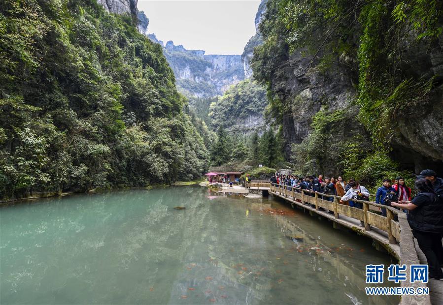 游客在天生三橋景區(qū)游覽(3月27日攝)。 隨著天氣轉(zhuǎn)暖,重慶武隆天生三橋景區(qū)風(fēng)景如畫,氣勢(shì)磅礴的天生石橋和綠意盎然的山林相映成趣,吸引眾多游客前來踏春賞景。 新華社記者劉潺攝