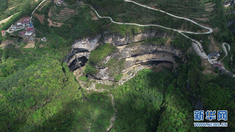 這是4月22日在陜西省漢中市寧強(qiáng)縣火石子村用無人機(jī)拍攝的地洞河天坑。位于陜西省漢中市寧強(qiáng)縣的地洞河天坑,是禪家?guī)r天坑群中規(guī)模最大的一處天坑,坑內(nèi)分布有石鐘乳、石筍,具有極高的地質(zhì)研究?jī)r(jià)值。 新華社記者 張博文 攝