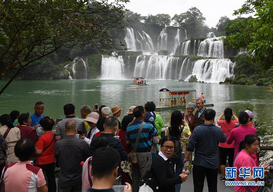 游客在廣西大新縣德天瀑布景區(qū)觀光(4月17日攝)。 新華社記者 陸波岸 攝
