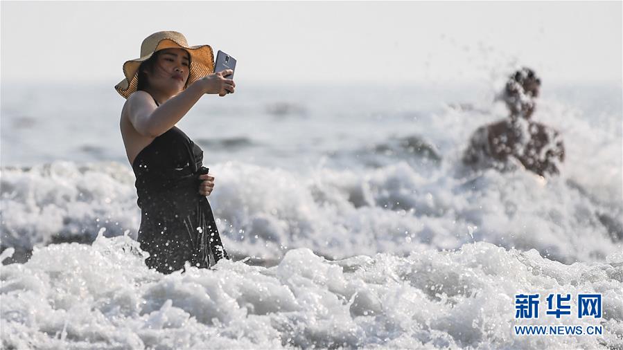 游客在北海市銀灘沖浪戲水(4月18日攝)。新華社記者張愛林?jǐn)z