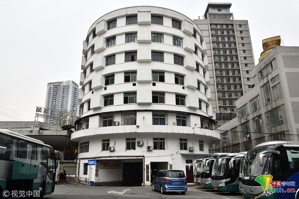 2018年12月6日,重慶江北紅旗河溝汽車站內(nèi),有一棟獨特的八層圓環(huán)狀建筑,底層每天有不少進出站的客車通行。