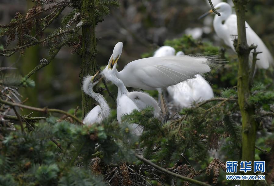 在江西省南昌市新建區(qū)象山森林公園內,白鷺和自己的雛鳥在一起(5月21日攝)。 近日,在江西省南昌市新建區(qū)象山森林公園內,已安家筑巢的大批鷺鳥陸續(xù)孵化出了后代。象山森林公園有著“鷺鳥王國”的美譽,生態(tài)環(huán)境良好,每年都會吸引白鷺、蒼鷺、夜鷺等種類的鷺鳥飛抵棲息和繁衍后代。 新華社記者 彭昭之 攝