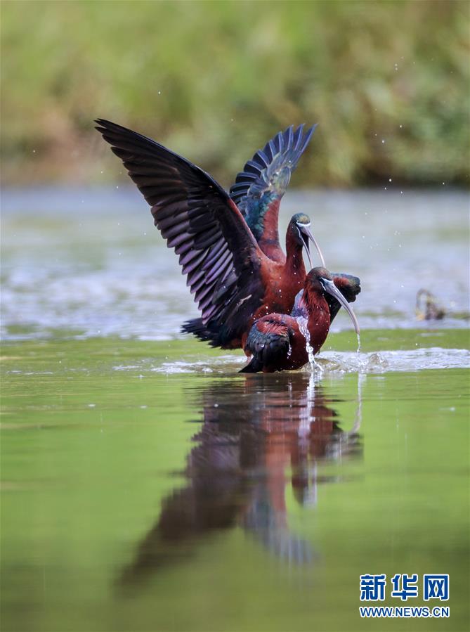 這是在漢江濕地公園嬉水的2只彩鹮(5月4日攝)。 近日,國(guó)家二級(jí)保護(hù)動(dòng)物彩鹮現(xiàn)身陜西省漢中市漢江濕地公園濂水河與漢江交匯處。 據(jù)陜西師范大學(xué)生命科學(xué)院教授于曉平介紹,彩鹮在世界上的分布比朱鹮還要少,這幾年在云南發(fā)現(xiàn)得多一些,這3只彩鹮現(xiàn)身漢江濂水河畔,是陜西首次發(fā)現(xiàn)彩鹮蹤跡。 據(jù)了解,彩鹮是國(guó)家二級(jí)保護(hù)動(dòng)物,屬鵜形目鹮科,體羽大部為青銅栗色,是珍稀鳥類朱鹮的“近親”,體型比朱鹮略小。 新華社發(fā)