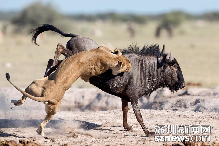 英國攝影師蘇-莫里斯(Sue Morri)在博茨瓦納Nxai Pan國家公園游玩,目睹了一場兇惡母獅獵食角馬的畫面。母獅甚至攀到了角馬背上,想要牢牢遏制住到手的“美餐”。強(qiáng)壯的角馬努力地與母獅抗?fàn)?,竭力想要保住自己的性命,但最終還是不敵母獅被拿下,最后成了母獅孩子們的盤中餐。