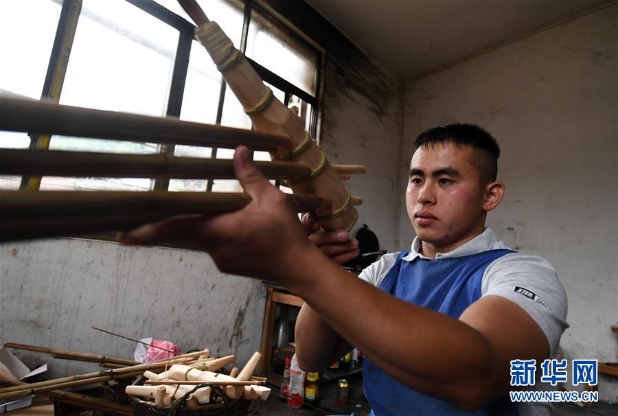 5月30日,在融水苗族自治縣安太鄉(xiāng)小桑村青山屯,杜信文在制作蘆笙。 新華社記者 陸波岸 攝