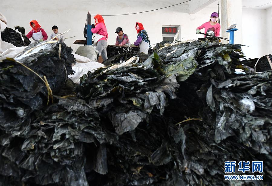 4月10日,霞浦縣長(zhǎng)春鎮(zhèn)埕塢村一家海帶加工廠內(nèi),工人在搬運(yùn)剛收獲的海帶。近日,福建省寧德市霞浦縣30余萬(wàn)畝養(yǎng)殖海帶進(jìn)入收獲季節(jié),當(dāng)?shù)仞B(yǎng)殖戶搶抓晴好天氣,收獲海帶。海帶養(yǎng)殖是霞浦縣群眾增收致富的支柱產(chǎn)業(yè)。2018年該縣海帶產(chǎn)量14萬(wàn)余噸。新華社記者 姜克紅 攝