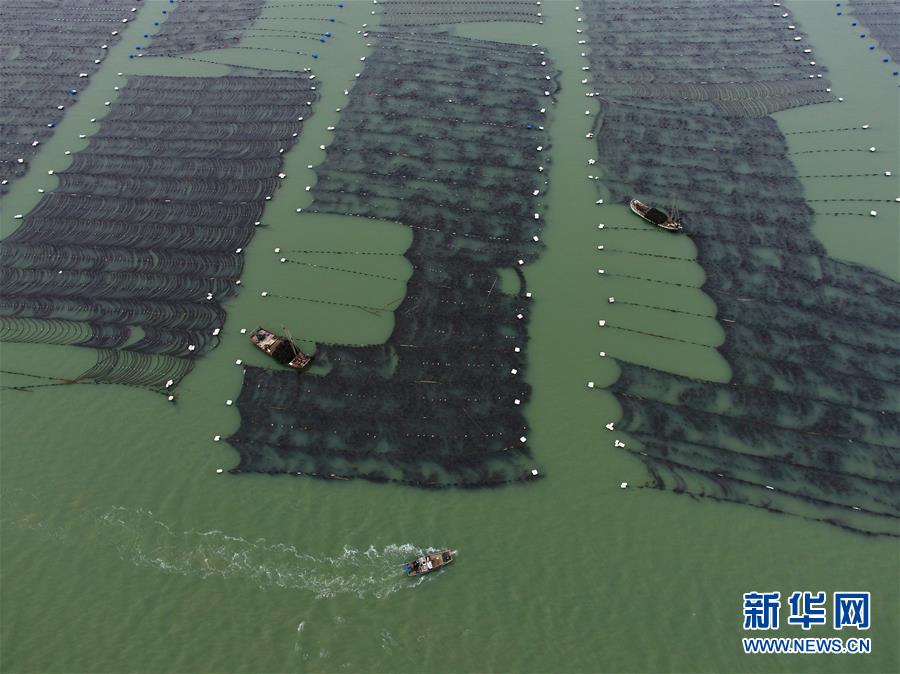 4月10日,霞浦縣長(zhǎng)春鎮(zhèn)海域,海帶養(yǎng)殖戶在用船只運(yùn)輸海帶(無(wú)人機(jī)拍攝)。近日,福建省寧德市霞浦縣30余萬(wàn)畝養(yǎng)殖海帶進(jìn)入收獲季節(jié),當(dāng)?shù)仞B(yǎng)殖戶搶抓晴好天氣,收獲海帶。海帶養(yǎng)殖是霞浦縣群眾增收致富的支柱產(chǎn)業(yè)。2018年該縣海帶產(chǎn)量14萬(wàn)余噸。新華社記者 姜克紅 攝