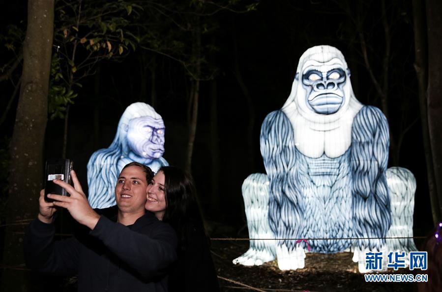 6月8日,在澳大利亞悉尼塔朗加動(dòng)物園,游客在大猩猩造型花燈前合影。新華社記者 白雪飛 攝