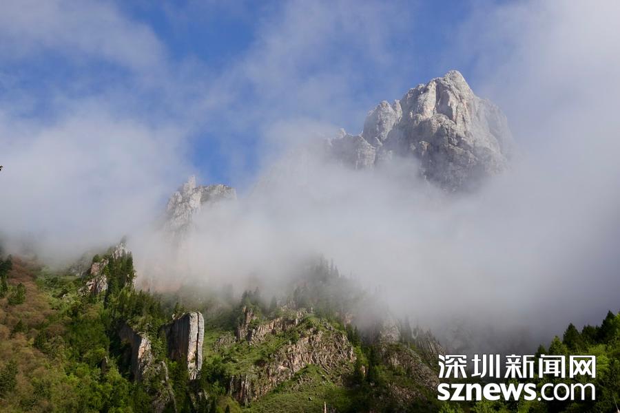 乘坐通往核心景區(qū)的旅游車進(jìn)入臨近壯觀山體的地段,從獨(dú)特的角度看到了云霧繚繞的山峰,真有置身仙境的感覺。李仁奇攝