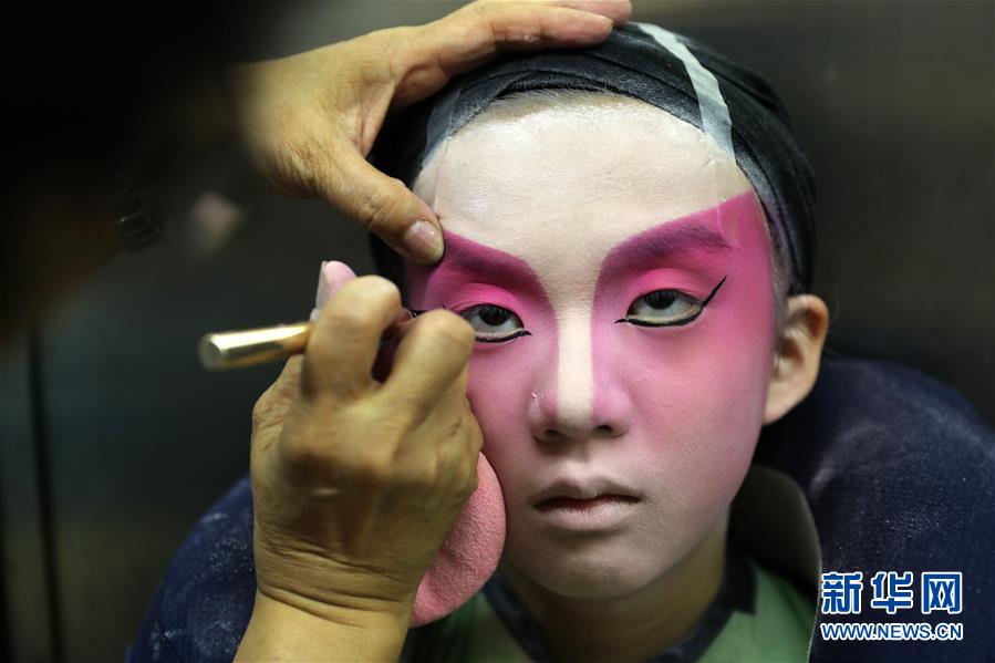 粵劇小演員陸瑞徽在畫經(jīng)典“紅白臉”妝容(6月8日攝)。 聲輝粵劇推廣協(xié)會成立于2003年,是香港重要粵劇藝術團體之一,致力于向青少年推廣粵劇。協(xié)會目前有兩個初班,3個中班,一個青少年班?;泟∮址Q“廣東大戲”,表演技藝包括“唱做念打”,即唱功、身段、臺詞、武打,主要流行于廣東、廣西和香港、澳門等地區(qū)。2009年,粵劇被列入聯(lián)合國教科文組織人類非物質(zhì)文化遺產(chǎn)代表作名錄,今年正逢十周年。 新華社記者 吳曉初 攝