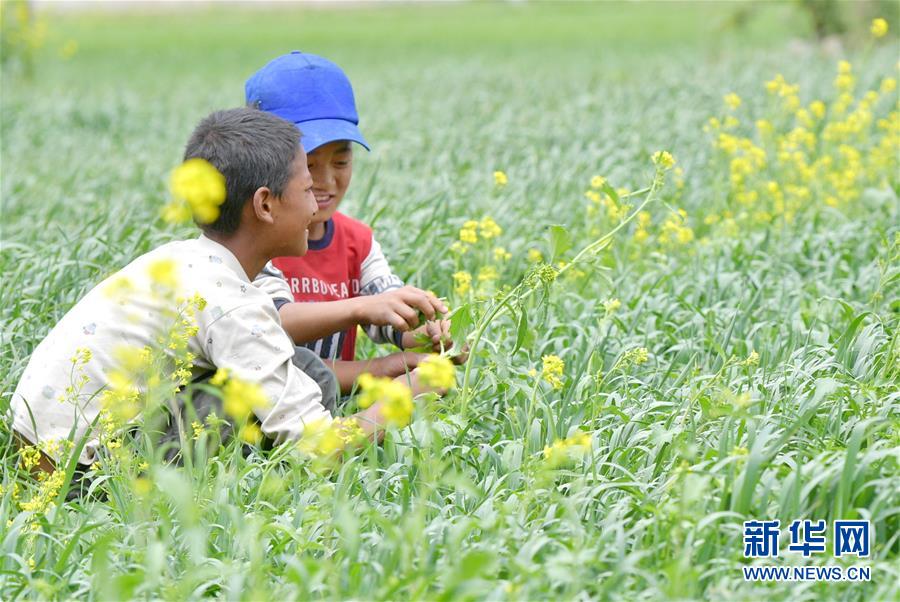 日喀則白朗縣巴扎鄉(xiāng)查吾沖村的兩名兒童在青稞地間玩耍(6月22日攝)。新華社記者 張汝鋒 攝