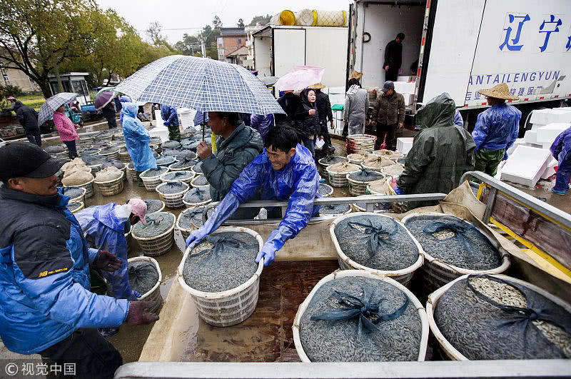 浙江臺(tái)州,三門(mén)縣花橋鎮(zhèn)柵下村的文化禮堂前,村民們冒雨和商販交易蟶苗,現(xiàn)場(chǎng)一片繁忙。據(jù)了解,花橋蟶苗屬于野生苗,存活率高,易成長(zhǎng),極受市場(chǎng)歡迎,一到捕撈季節(jié),遼寧、山東、江蘇和浙江的養(yǎng)殖戶和蟶苗小販爭(zhēng)相到花橋購(gòu)買優(yōu)質(zhì)蟶苗。