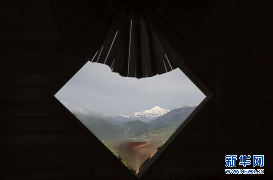 透過阿尼瑪卿雪山附近一個農家樂的窗戶遙望阿尼瑪卿雪山(7月10日攝)。 新華社記者 費茂華 攝