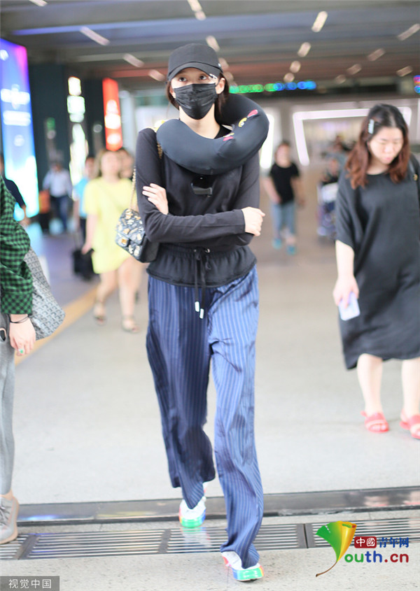 關(guān)曉彤淡定抱臂行走 脖子上掛U型枕毫無偶像包袱