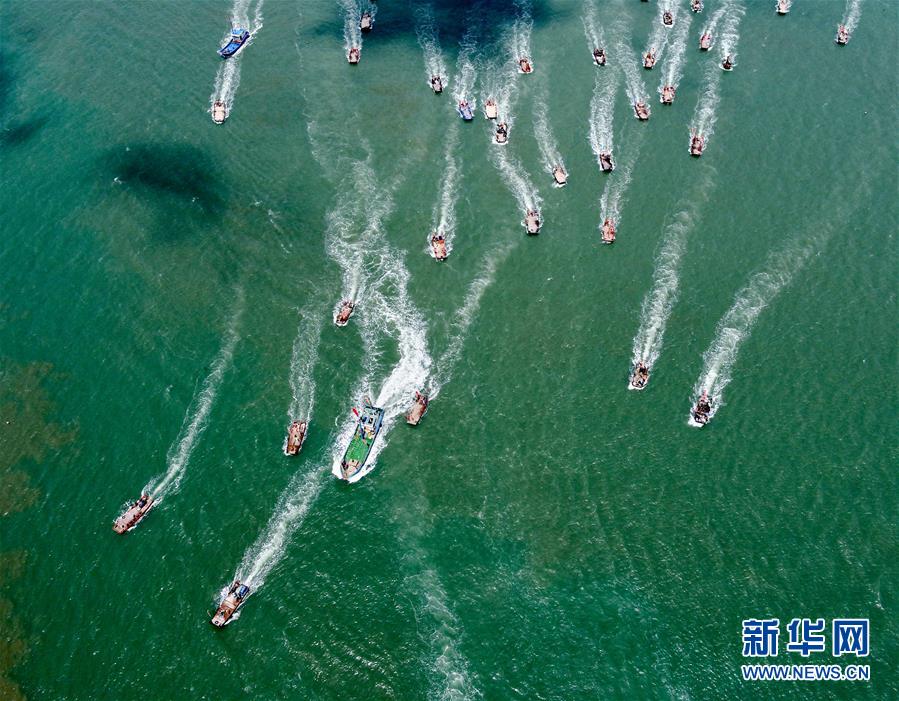 8月3日,在首屆福清開(kāi)漁節(jié)上,漁船駛向大海(無(wú)人機(jī)拍攝)。新華社記者姜克紅攝